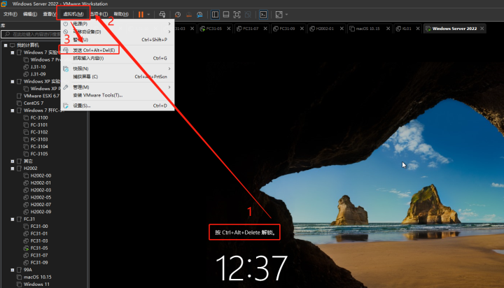 5.23.3 選擇【VM任務欄】-【虛擬機】-【發(fā)送Ctrl+Alt+Del】解鎖server屏幕
