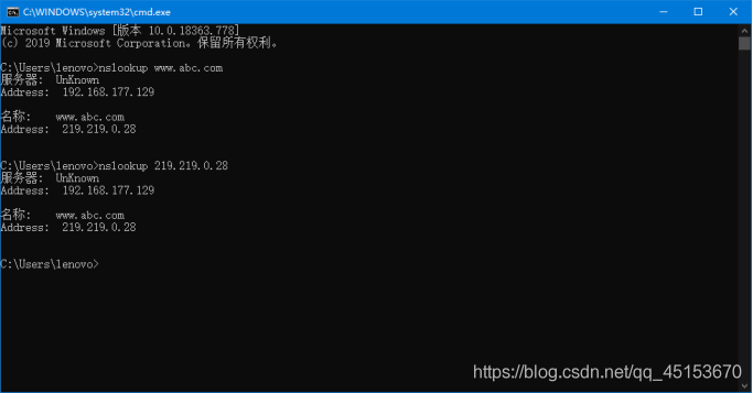 步驟7: 在本機(jī)cmd下分別輸入 nslookup www.abc.com 和 nslookup 219.219.0.28
