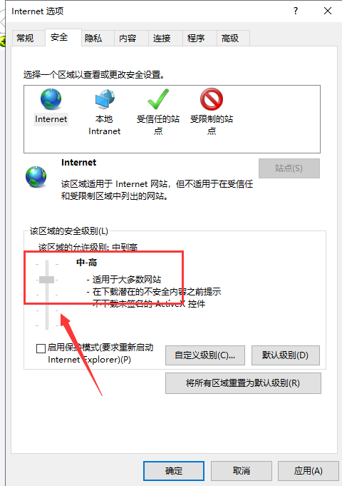 然后又要進Internet選項→安全→該區域的安全級別,而且還不讓你把級別拉到最低,非得一個個允許下載,允許各種腳本……