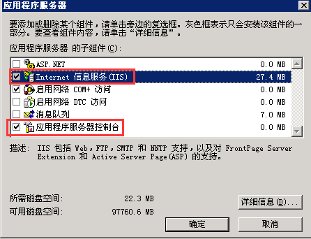5、點(diǎn)擊【是】后能看到【IIS】和【應(yīng)用程序服務(wù)器控制臺(tái)】前的勾已經(jīng)取消了,點(diǎn)擊【確定】【下一步】