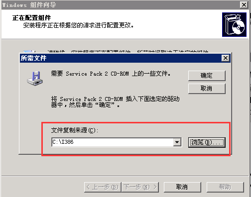 6、點(diǎn)擊【下一步】配置組件,期間會(huì)提示需要一些文件,我們只需要將文件來(lái)源選擇到剛開(kāi)始解壓出來(lái)的i386文件夾,點(diǎn)擊確定即可。