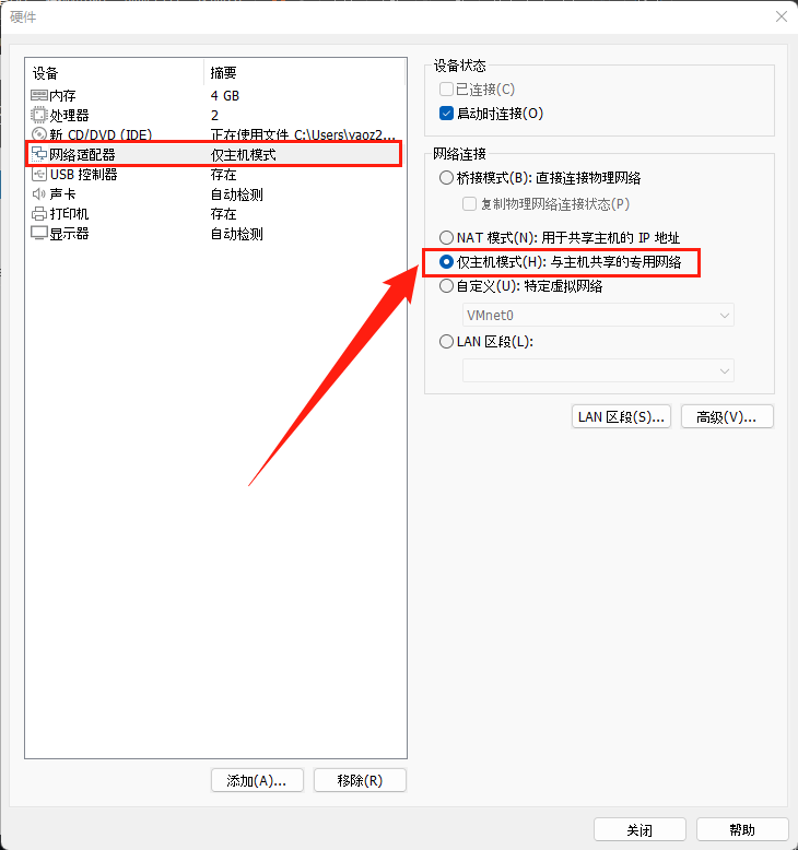 將虛擬機網卡更改為僅主機模式(或自定義(U):特定虛擬網絡)。網絡連接調整為僅主機模式的作用是讓DHCP服務器存在于一個LAN中,后續的DHCP客戶端也需要將網卡模式改為僅主機模式(或自定義(U):特定虛擬網絡)。