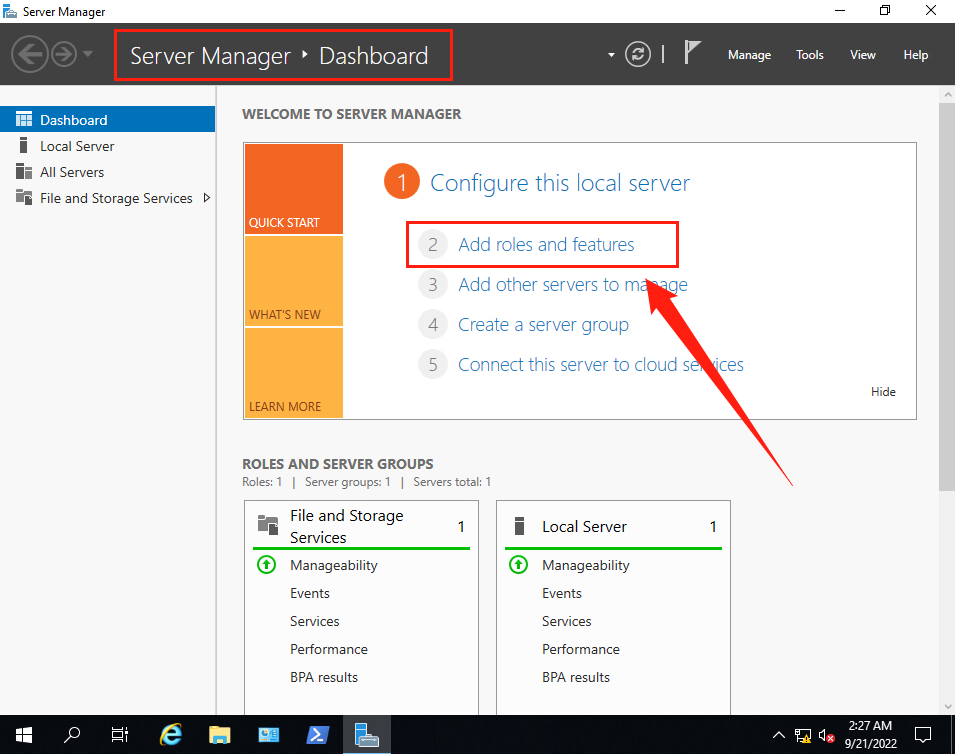 (1)打開【Server Manager】,點擊【Add roles and features】。