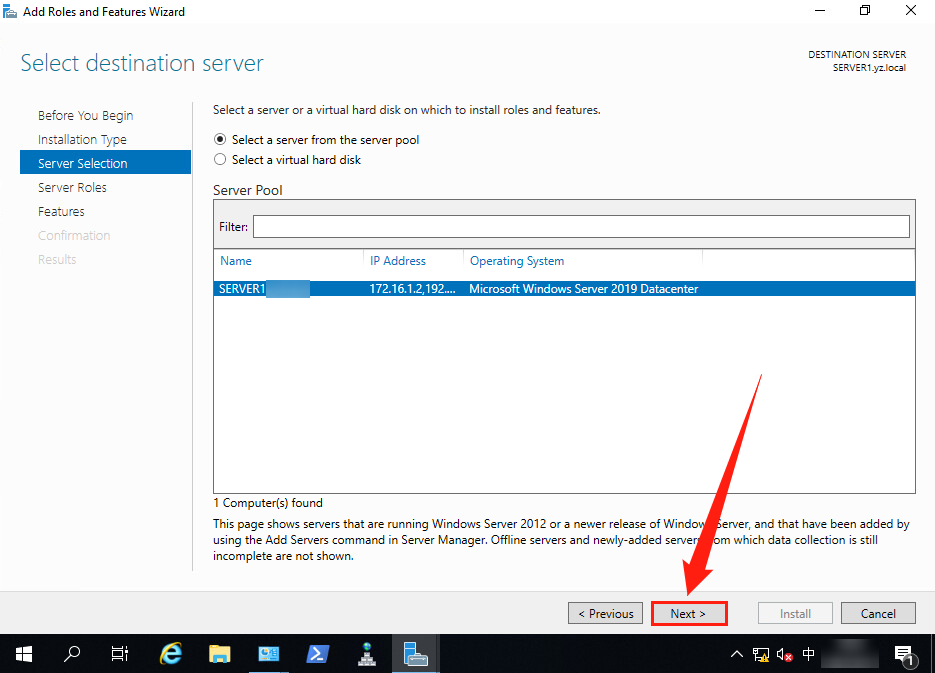 (4)進入【Slelect destination server】界面, 選擇【Select a server from the server pool】, 選擇當前服務器Server 1。
