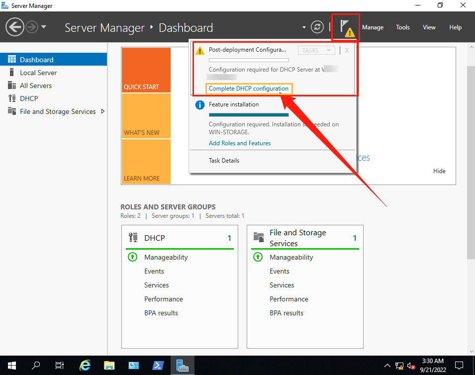 打開【Server Manager】,在安裝完DHCP后,由于DHCP的授權配置還未設置,所以在儀表盤界面,會有一個黃色的感嘆號,點擊它,會發現系統提示還未完成DHCP服務器必要的配置。
