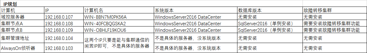 AlwaysOn是SqlServer實現高可用的解決方案之一,需要部署在Windows故障轉移集群(WSFC)上,Windows集群中每個節點上開啟了AlwaysOn的SQLServer應用組成了SQLServer集群。下面是Windows集群及AlwaysOn的IP規劃: