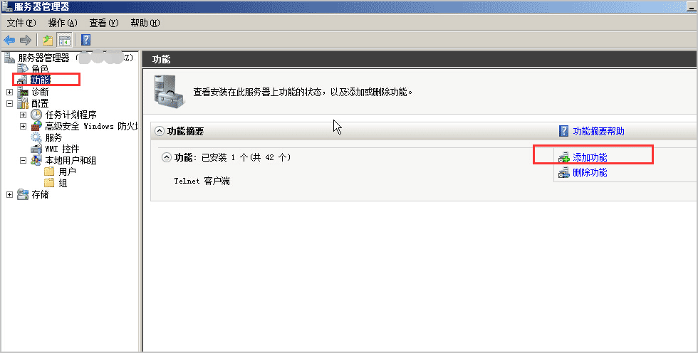 1、登錄實例,選擇 開始 > 控制面板 > 管理工具 > 服務器管理器 > 功能, 單擊右側 添加功能。