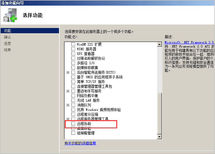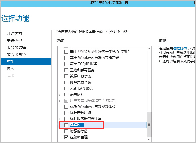 3、在彈出的添加角色和功能向導中,單擊下一步直到 功能 設置部分,勾選 遠程協助,單擊 下一步 直到完成。