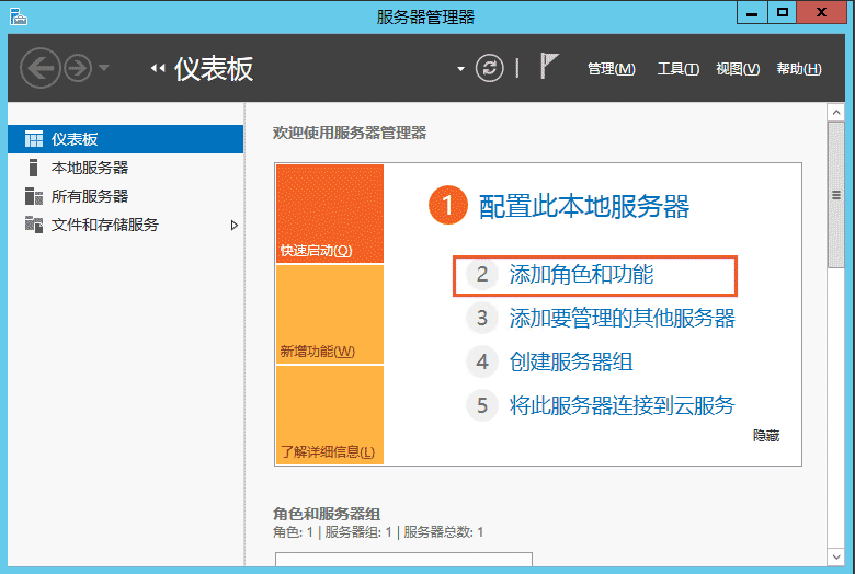 2、在彈出的服務器管理器窗口,單擊右側 添加角色和功能