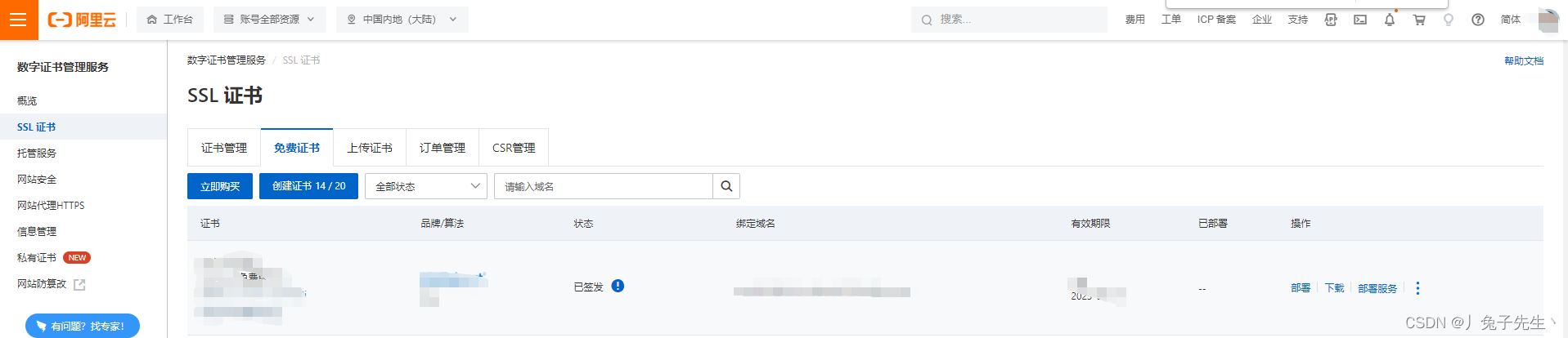 4)選擇“免費證書”并創(chuàng)建證書提交申請,審核通過后如下會有一個SSL證書