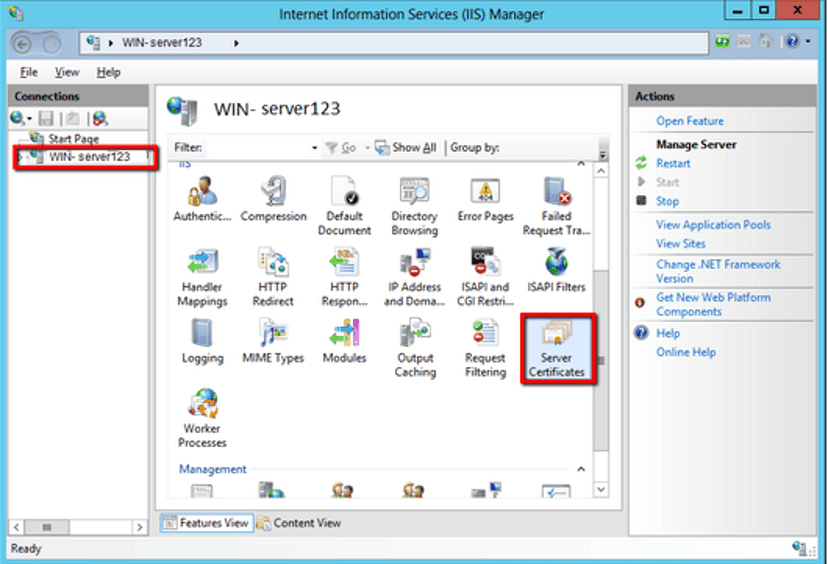 2.在【Internet信息服務(IIS)管理器】主窗口的【鏈接】菜單中,選擇將要安裝證書的服務器名稱。