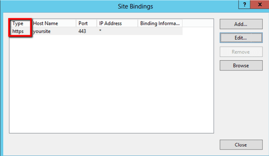 5.在新打開的【站點綁定】窗口中,如果沒有HTTPS綁定,請單擊【添加】,如果已有HTTPS綁定,請選中它并單擊【編輯】。