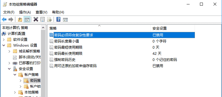1、計算機配置 - Windows設置 - 安全設置 - 帳戶策略 - 密碼策略:”密碼必須符合復雜性要求”,設置為”已禁用”。