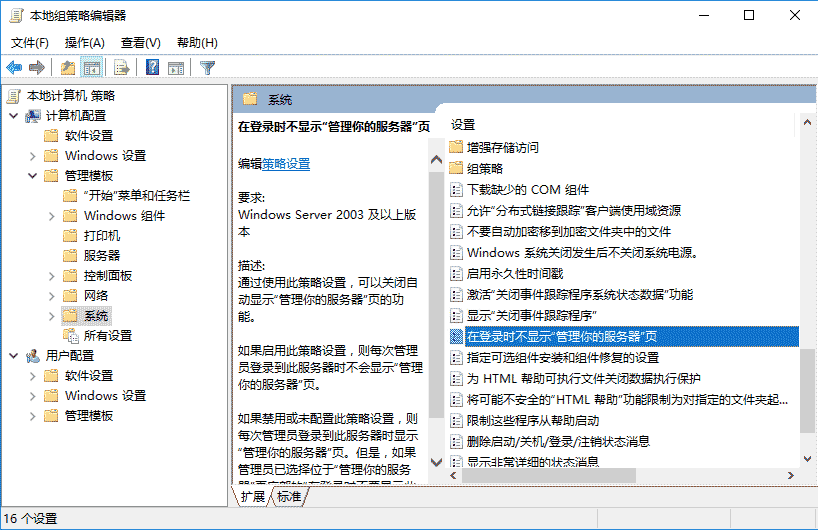 5、計算機配置 - 管理模板 - 系統,登錄時不顯示”管理你的服務器”頁,設置為”已啟用”。