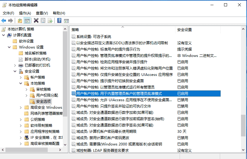 6、最好是新建一個用戶。也可以使用Administrator(內置管理員),但要啟用批準模式,組策略,計算機配置 - Windows設置 - 安全設置 - 本地策略 - 安全選項,”用于內置管理員帳戶的管理員批準模式”,設置為”已啟用”,重啟后生效。