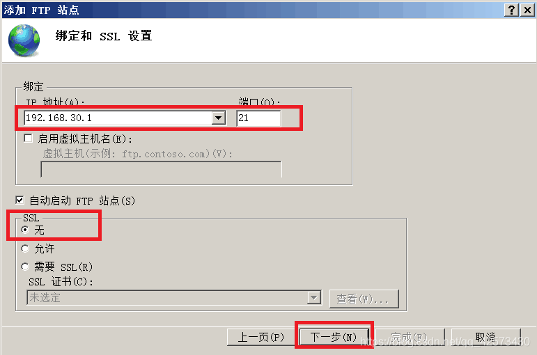 FTP站點,默認狀態下,IIS管理器中只有一個Web站點,要新建一個站點,單擊右側的新建FTP站點,啟動添加FTP站點向導,并為新建的站點起個名字,還要指定一個FTP站點的主目錄,主目錄的路徑為C:\ftp,指定站點的IP地址(192.168.30.1)為和端口號,SSL勾選無,執行下一步