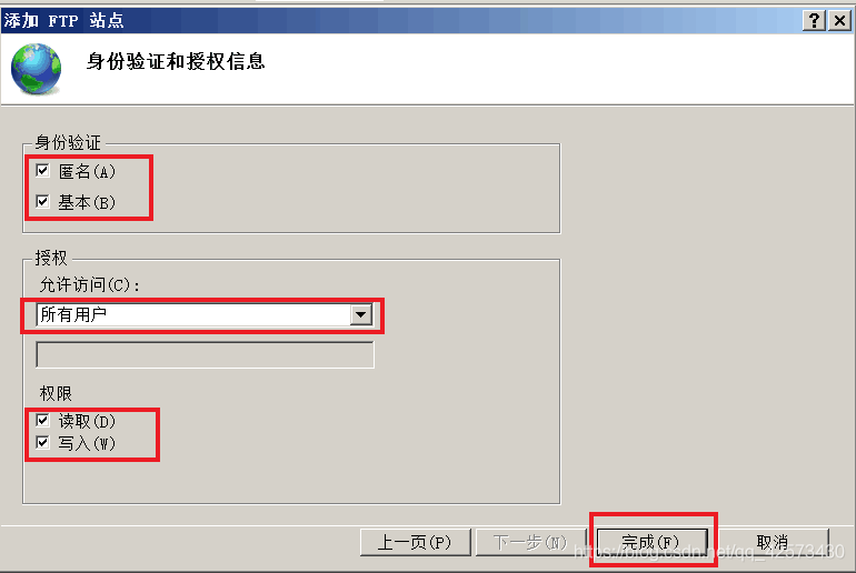 不勾選基本,授權選擇所有用戶,權限勾選讀取和寫入,單擊完成,FTP服務配置完成