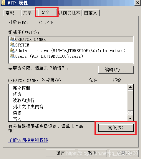 瀏覽打開FTP站點指定的主目錄,右擊空白處單擊屬性,選擇安全,為保證FTP用戶權限分配明確,最好把除了administrator之外的用戶刪除,也可以不刪除,單擊高級,選擇更改權限,并將包括可從該對象的父項繼承的規則的勾選去掉,單擊添加