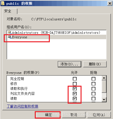 8.為文件夾public添加everyone(匿名用戶)權限,當匿名用戶訪問時只能訪問public文件夾,單擊屬性-安全-編輯-添加用戶everyone,只有讀取和執行、列出文件夾內容、讀取權限