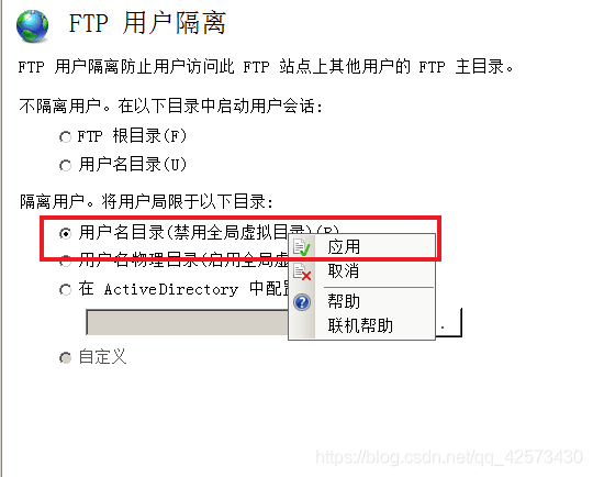 9.打開IIS管理器,打開FTP用戶隔離,勾選隔離用戶-用戶名目錄,右擊選擇應用