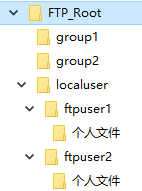 localuser內(nèi)用戶文件夾名稱必須與上一步創(chuàng)建的FTP用戶名一致,否則無法登陸,另外兩個group文件夾用于設置虛擬目錄共享。
