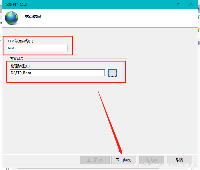 2)填寫FTP站點名稱,選擇FTP根目錄,單擊下一步