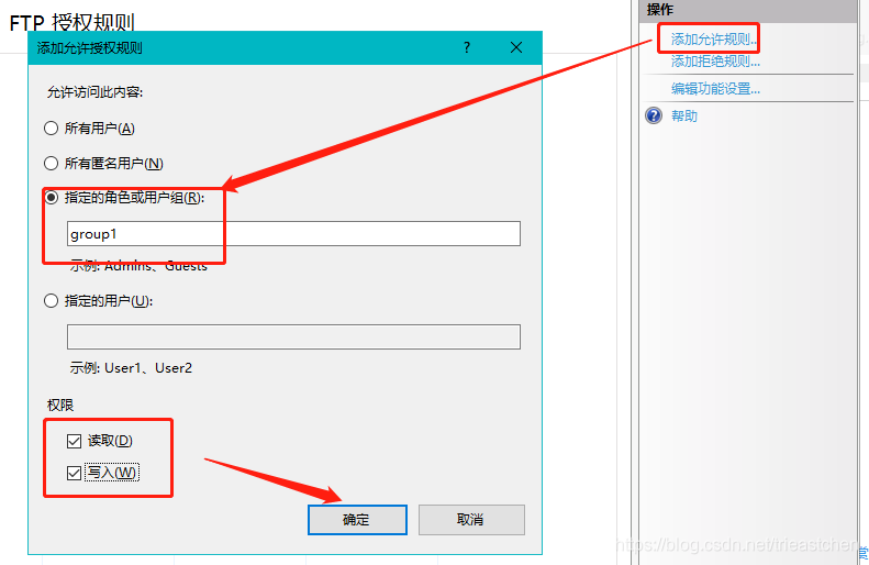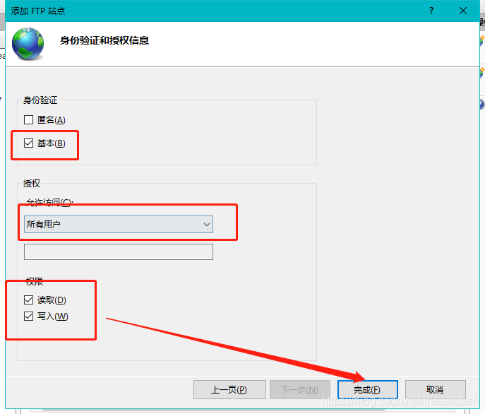 4)勾選基本身份驗證(匿名是否勾選根據(jù)實際情況選擇,此處方案不允許匿名登錄,不勾選),選擇允許所有用戶訪問,勾選讀取、寫入,單擊完成。