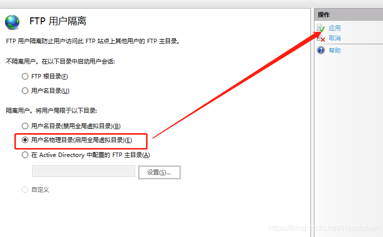3)選中“用戶名物理目錄(啟用全局虛擬目錄)”,然后單擊右側(cè)應用