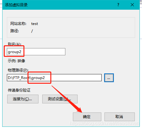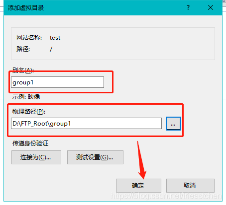 填寫虛擬目錄名稱和路徑,虛擬目錄名稱與之前設置的文件夾名稱一致,單擊確定