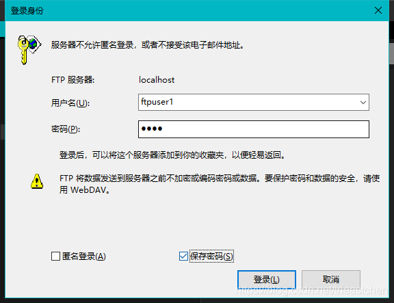 在彈出的對話框中輸入前面創(chuàng)建的FTP用戶名及密碼,單擊登錄