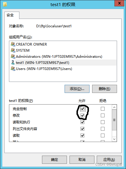 修改test1文件夾NTFS屬性,使test1用戶不僅有FTP的上傳下載權限,也可以對其修改刪除等完全控制權限。