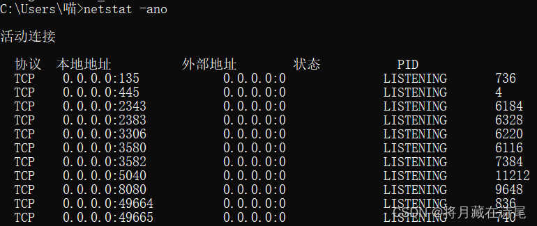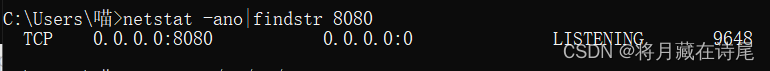 2、輸入命令, 查找項目配置的端口號對應的tcp號(最后一列的數字) netstat -ano|findstr 8080