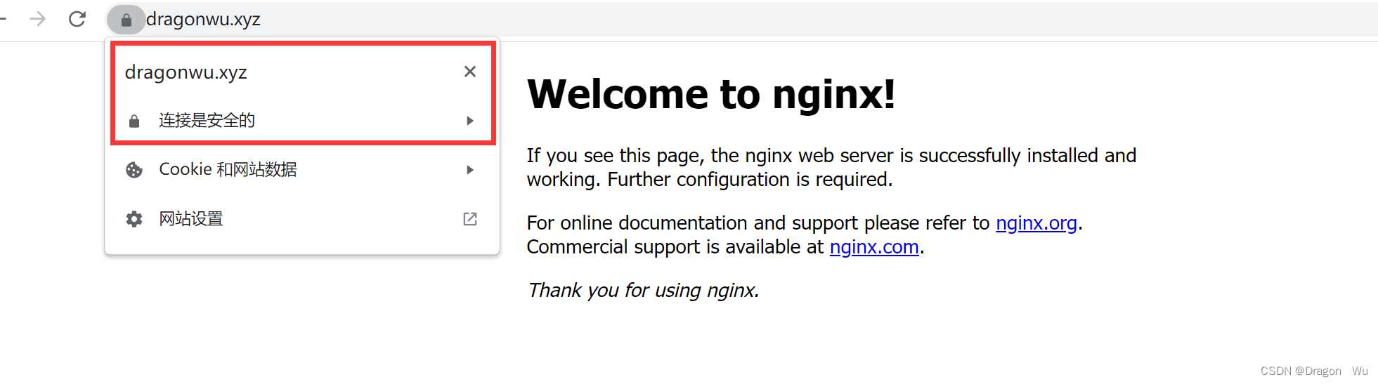 server {listen 80;#填寫綁定證書的域名server_name dragonwu.xyz; #charset koi8-r; #access_log logs/host.access.log main; #強(qiáng)制將http的URL重寫成httpsreturn 301 https://$host$request_uri; } server {listen 443 ssl;server_name dragonwu.xyz; #你的域名 ssl_certificate /usr/local/ssl/dragonwu.xyz_cert_chain.pem; #證書ssl_certificate_key /usr/local/ssl/dragonwu.xyz_key.key; #證書 ssl_session_cache shared:SSL:1m;ssl_session_timeout 5m; ssl_ciphers HIGH:!aNULL:!MD5;ssl_prefer_server_ciphers on; location / { root html; index index.html index.htm;} }Nginx服務(wù)器重新加載: