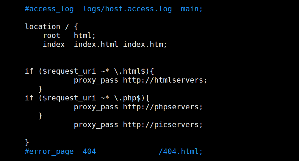 location / { root html; index index.html index.htm;if ($request_uri ~* \.html$){ proxy_pass http://htmlservers; }if ($request_uri ~* \.php$){ proxy_pass http://phpservers; } proxy_pass http://picservers;} 注釋: