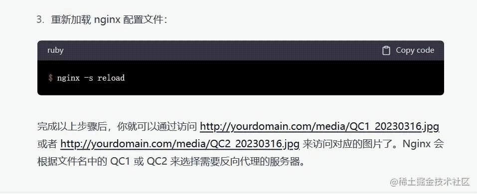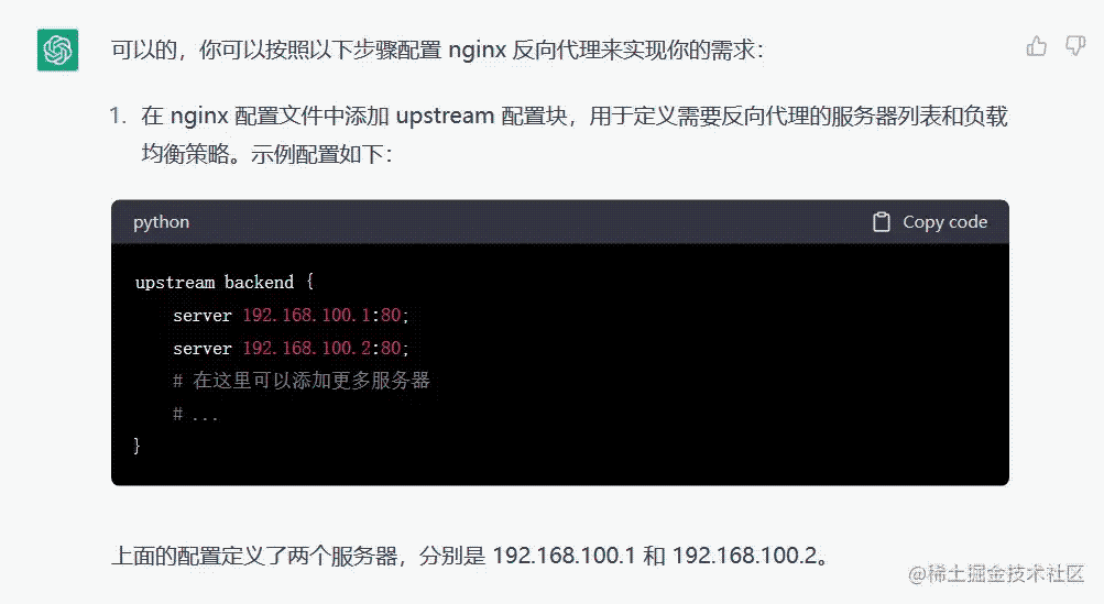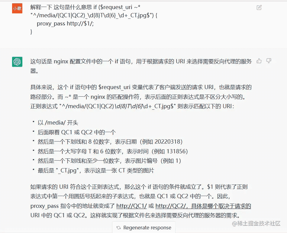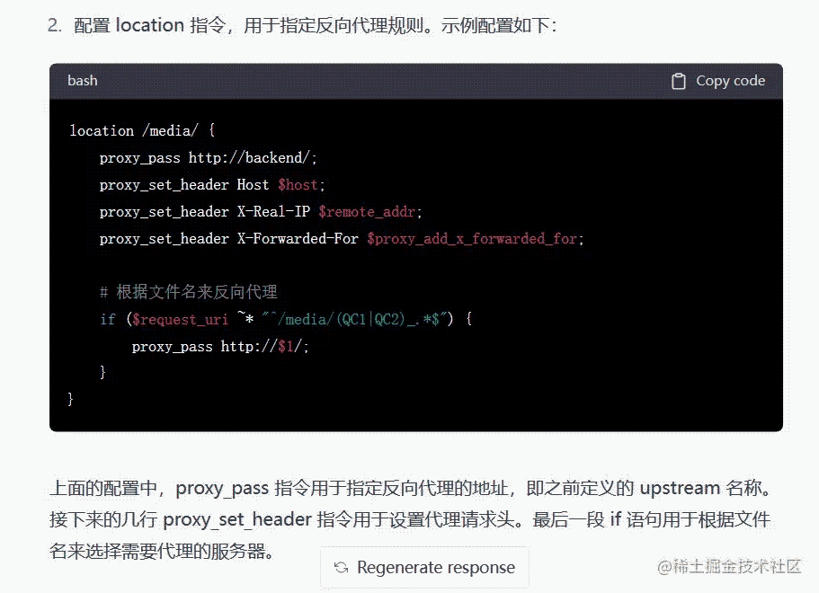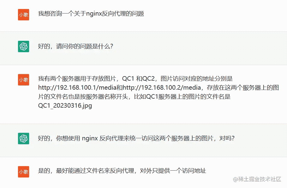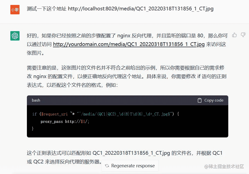我向 ChatGPT 說明了我要咨詢關(guān)于 Nginx 反向代理的問題,并簡(jiǎn)單介紹了背景。ChatGPT 很快就理解了我的問題,并提供了如下的 Nginx 配置