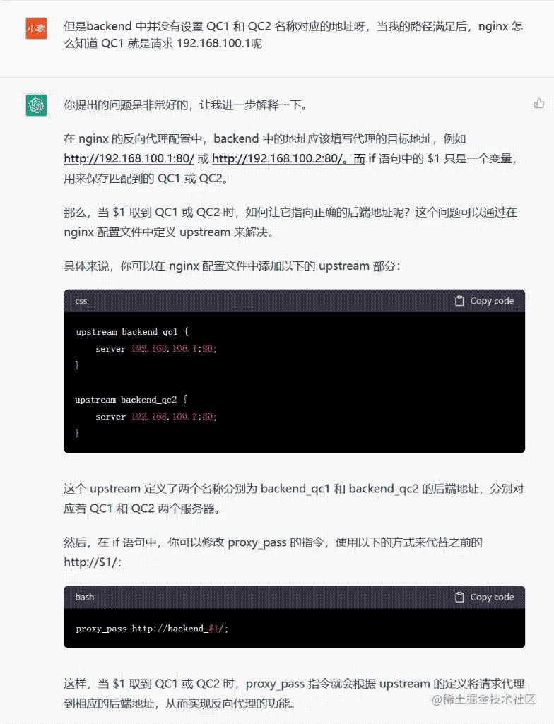 這個(gè)時(shí)候我大概明白了,只要我們拿到 $1 變量,就可以實(shí)現(xiàn)根據(jù)照片的文件名來反向代理服務(wù)器的請(qǐng)求。但是之前它提供的 upstream 配置中并沒有QC1和QC2對(duì)應(yīng)的地址,還是繼續(xù)讓 ChatGPT 修改。