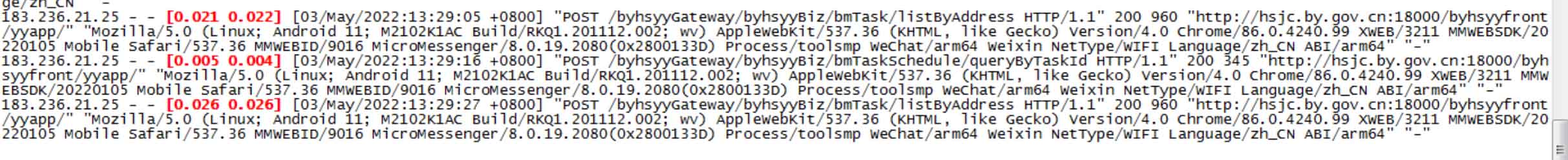 上線了一個小的預約程序,配置通過Nginx進行訪問入口,默認的日志是沒有請求時間的,因此需要配置一下,將每一次的請求的訪問響應時間記錄出來,備查與優化使用.