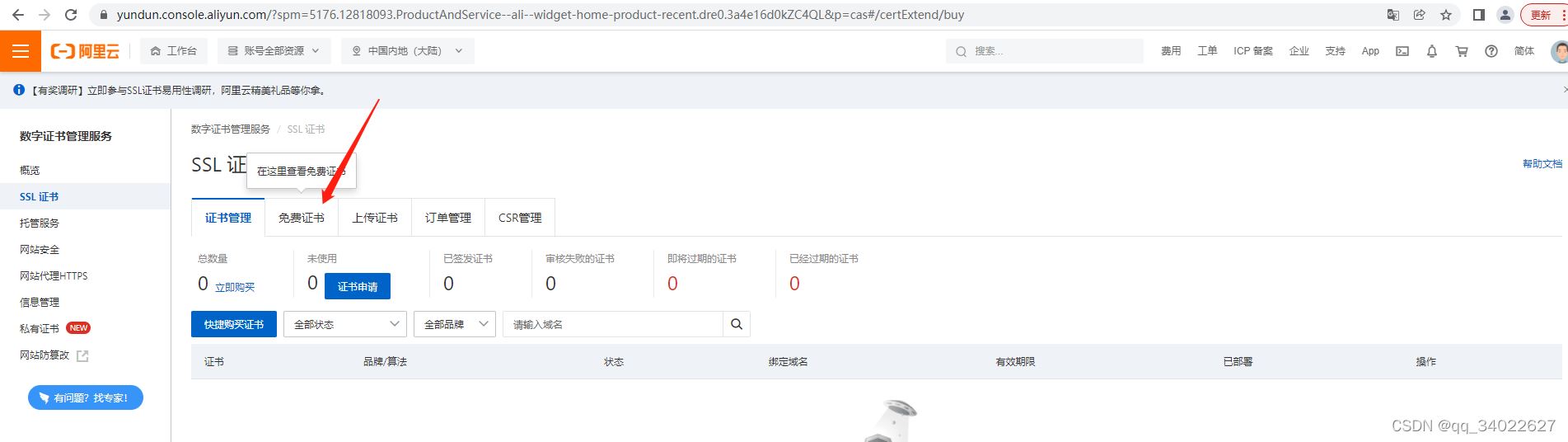 - 一丶登錄阿里云或者騰訊云等域名控制器下載免費證書