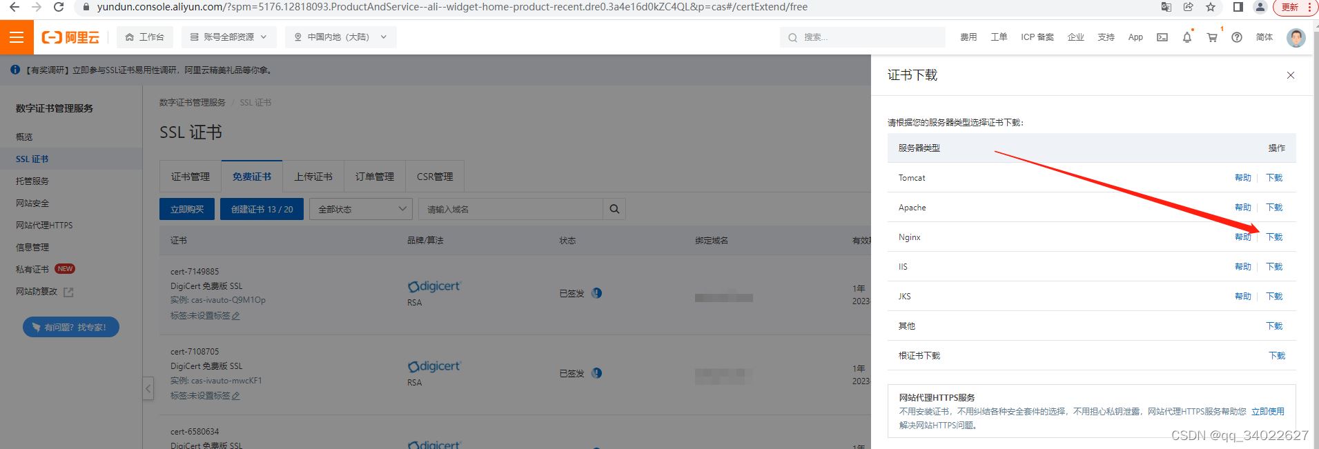 一丶登錄阿里云或者騰訊云等域名控制器下載免費證書