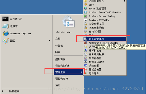 3. 打開服務(wù)器管理器:系統(tǒng)中點(diǎn)擊 “開始菜單程序”——> 管理工具 ——>服務(wù)器管理器