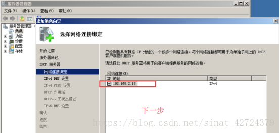 8. 進(jìn)入選擇網(wǎng)絡(luò)連接綁定,勾選IP地址;安裝程序?qū)⒆詣?dòng)檢查你的服務(wù)器是否具有一個(gè)靜態(tài)IP地址,第2步設(shè)置了則會(huì)被檢測顯示出來。