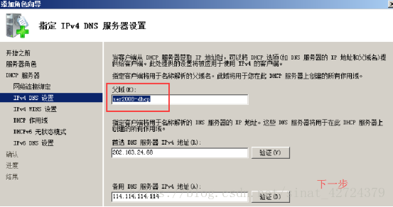 9. 接下來到“IPv4DNS設(shè)置”,需要輸入你的父域名和DNS服務(wù)器的IP地址,這個(gè)域?qū)⒂糜谖覀冊谶@臺(tái)DHCP服務(wù)器上創(chuàng)建的所有作用域; 當(dāng)DHCP更新IP地址信息的時(shí)候,相應(yīng)的DNS更新會(huì)將計(jì)算機(jī)的名稱到IP地址的關(guān)聯(lián)進(jìn)行同步。