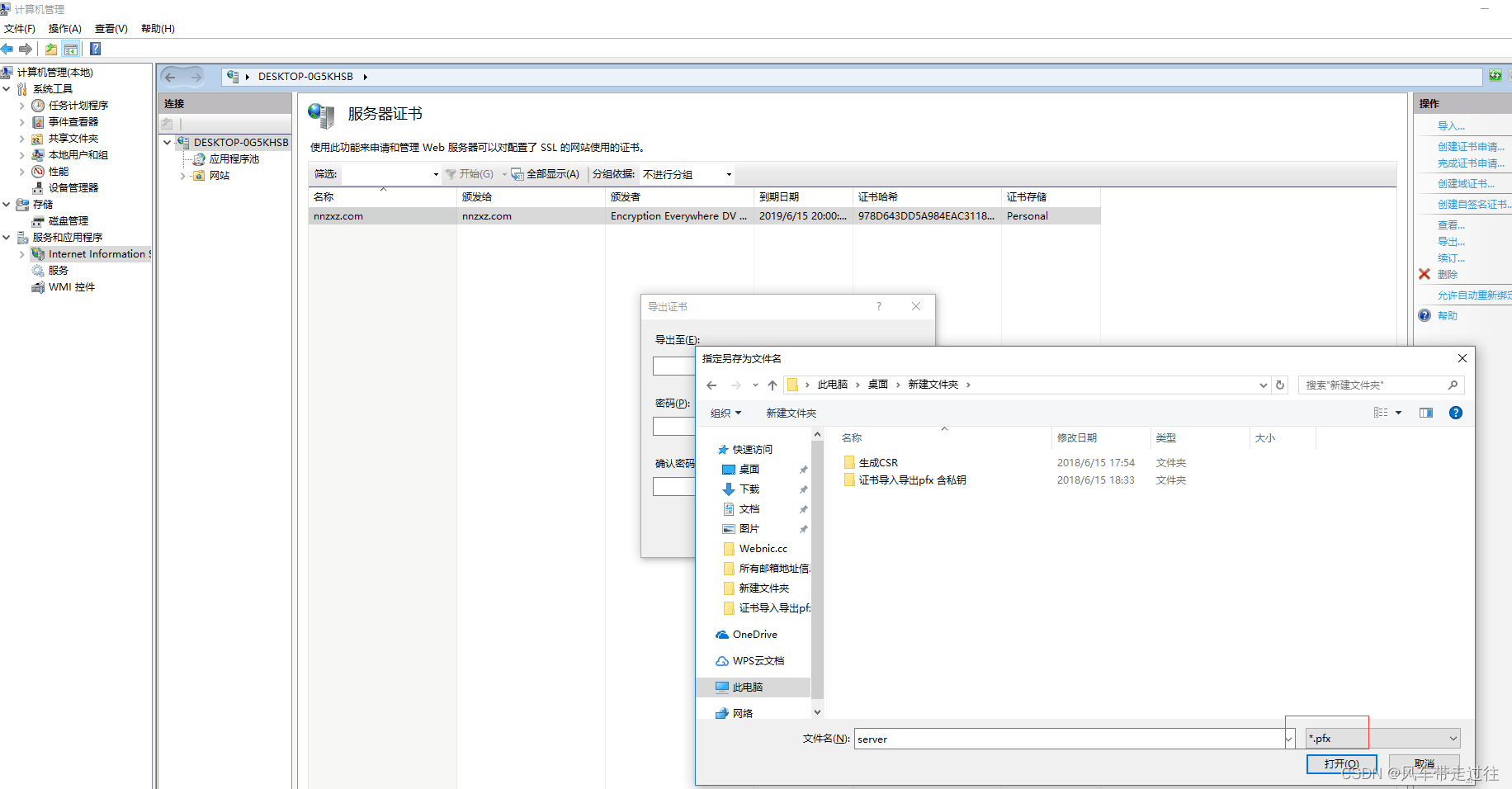 選中剛導入的證書,導出證書備份*.pfx.此文件可用作證書備份,及在其他機器中直接導入使用(在IIS中,選中左側根節點,在右側”功能視圖“中,打開“服務器證書”,在最右側的“操作”窗口,點擊”導入”,如果攜帶中級證書,其他機器先部署中級證書)。如下圖所示: