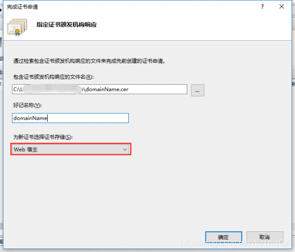 在“完成證書申請”界面,選擇cer文件并填寫相關信息,點擊確定。導入證書前建議將文件名改為你的域名。