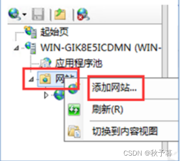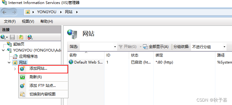 1)調整網頁目錄、在IIS管理器中,首選禁用默認站點,再右擊“網站”添加站點”