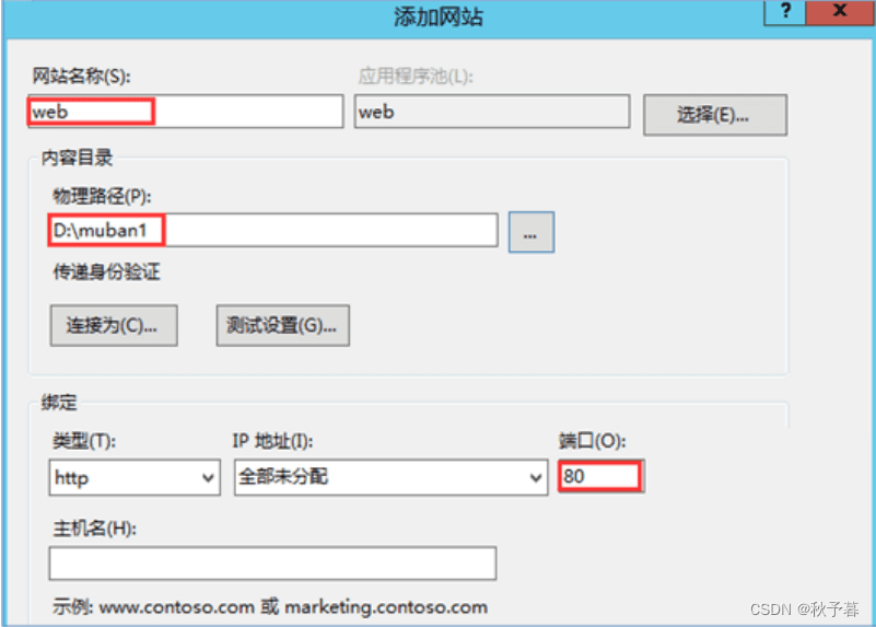 在彈出的“添加網站”對話框中,網站名輸web,“物理路徑”D:\muban1