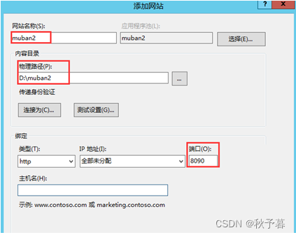 2)基于案例6再添加一個新的網站,站點名muban2,物理路徑D:\muban2,端口8090