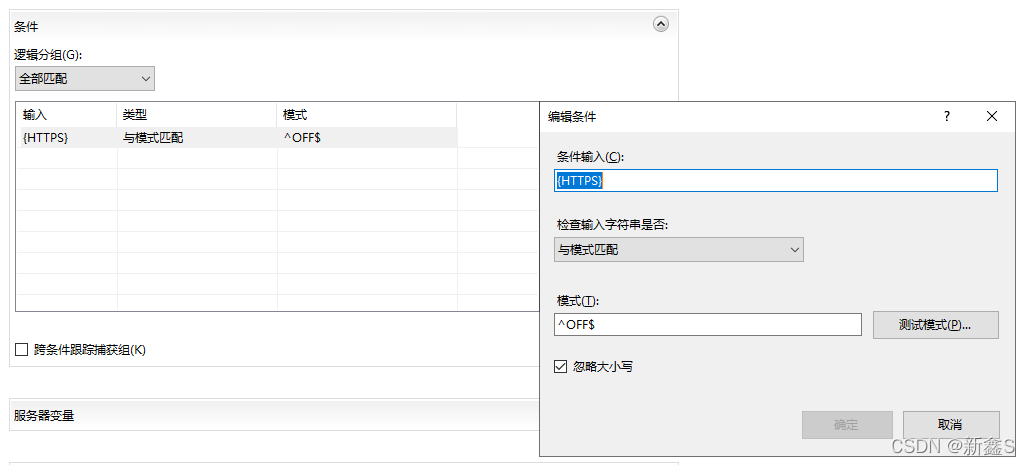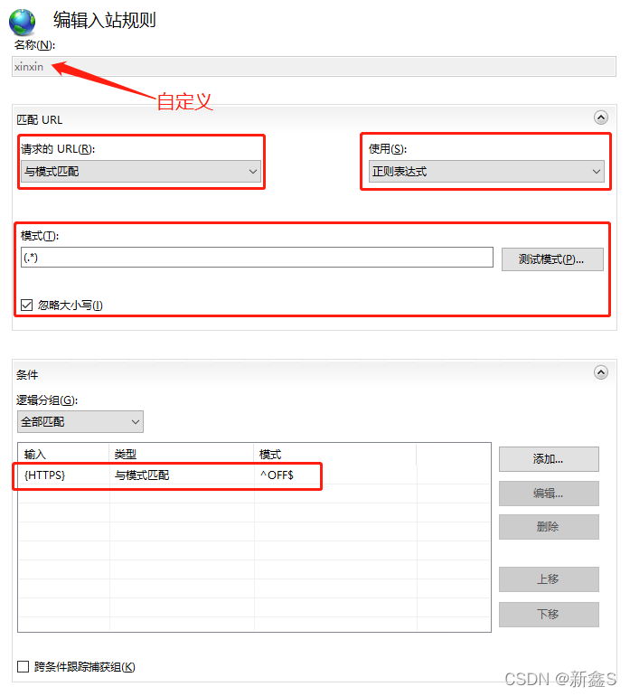 <rewrite> <rules><rule name='xinxin' stopProcessing='true'> <match url='(.*)' /> <conditions><add input='{HTTPS}' pattern='^OFF$' /> </conditions> <action type='Redirect' url='https://{HTTP_HOST}/{R:1}' redirectType='Permanent' /></rule> </rules></rewrite>這些代碼對應的就是第一種方法保存后的邏輯代碼,其中的name值對應的就是上面我們自定義的規則名稱。