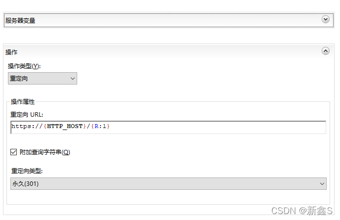 操作類型為重定向,重定向URL為https://{HTTP_HOST}/{R:1},勾選附加查詢字符串,重定向類型為永久(301)。