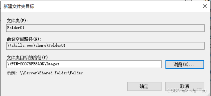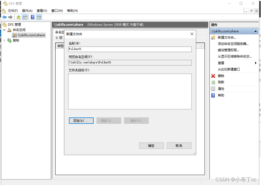 點DFS管理服務,點擊創建好的文件夾,點擊添加共享文件夾目標,找到剛才創建好的目錄